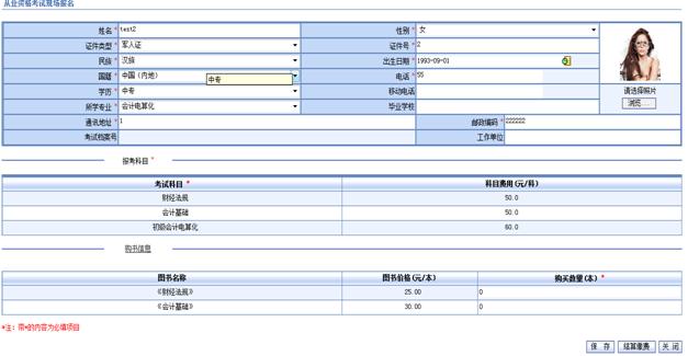 填寫報名考生個人基本信息,瀏覽上傳小于20kb的jpg照片(照片處理請參閱附錄),如果需要購買教材,