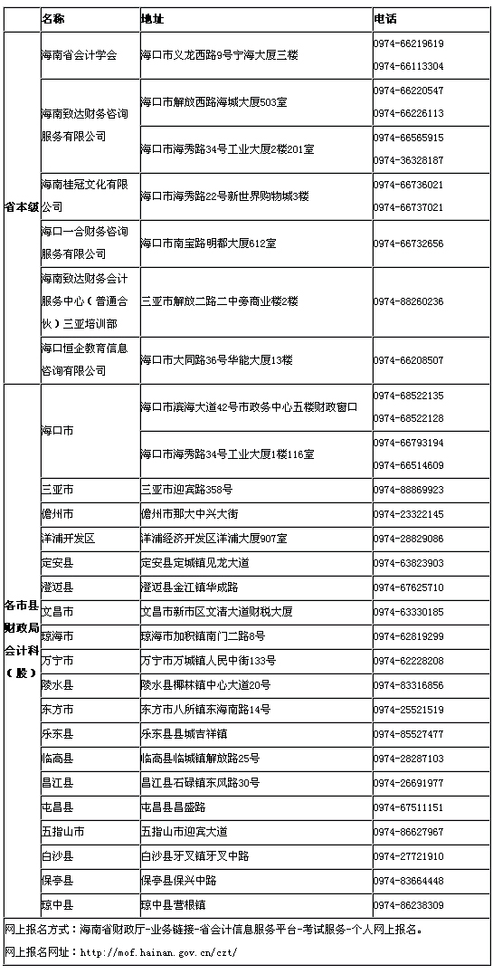 2014年第一次海南會計從業資格考試報名點聯系方式