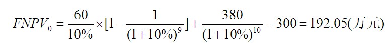 因為FNPV0(10%)=192.05(萬元)>0,所以該投資方案是可行的。