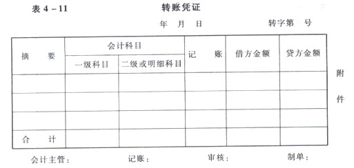 轉(zhuǎn)賬憑證是用于不涉及現(xiàn)金和銀行存款收付業(yè)務(wù)的其他轉(zhuǎn)賬業(yè)務(wù)所用的記賬憑證。一般格式如教材表4-11所示。