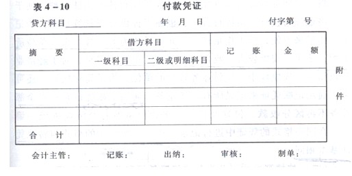 付款憑證是用于現(xiàn)金及銀行存款付出業(yè)務(wù)的記賬憑證。一般格式如教材表4-10所示。