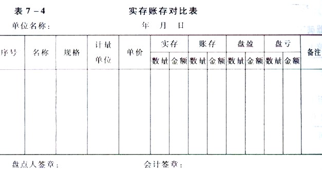 對各項財產物資的盤點結果,應逐一填制“盤存單”,并同賬面余額記錄核對,確認盤盈盤虧數,填制“實存賬存對比表”,作為調整賬面記錄的原始憑證。盤存單及實存賬存對比表的格式如表7―3與表7―4所示。