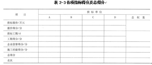 試在表2-3中填制每個(gè)投標(biāo)單位各項(xiàng)指標(biāo)得分及總得分。其中報(bào)價(jià)得分要求列出計(jì)算式。請(qǐng)根據(jù)總得分列出名次并確定中標(biāo)單位。