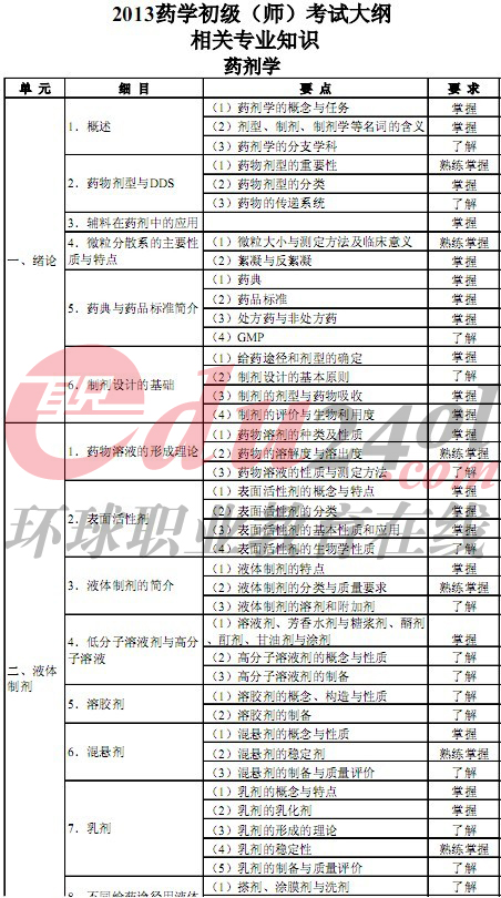 2013藥學職稱初級藥師(代碼201)考試大綱-相關專業知識