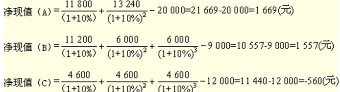 【例題?教材例題】設預定的折現率為10%,有三項投資方案,其有關數據如表所示。計算各方案的凈現值并選擇比較滿意的方案。
