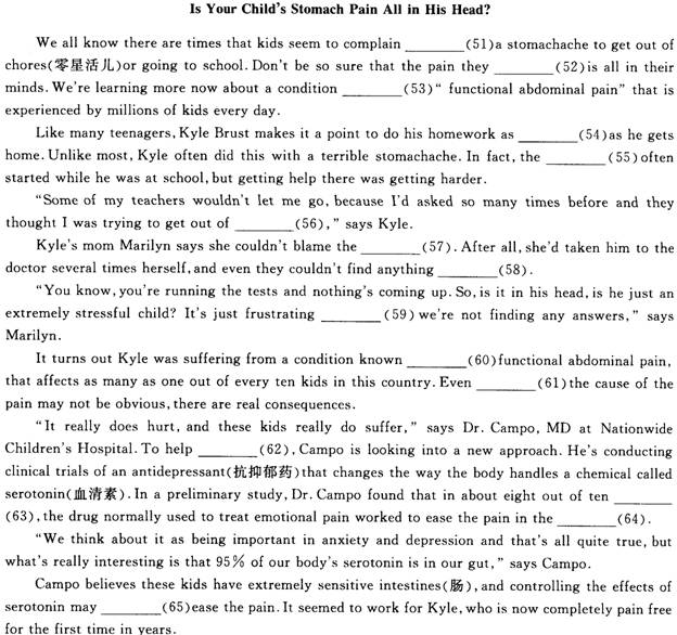 55.D【解析】前一句的末尾提到了a terrible stomach pain,因此,接下來談的還應(yīng)是the pain•故選D。