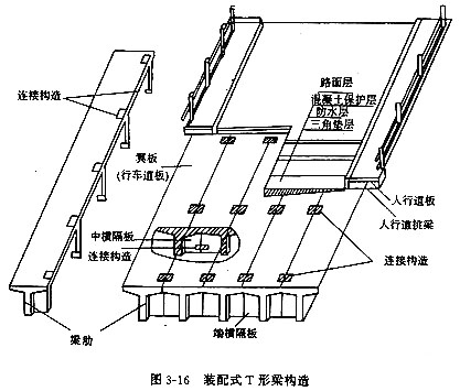 2)肋梁式簡支梁橋(簡稱簡支梁橋)。簡支梁橋主要用于中等跨度的橋梁。中小跨徑在8-12m時,采用鋼筋混凝土簡支梁橋;跨徑在20-50m時,多采用預(yù)應(yīng)力混凝土簡支梁橋。在我國使用最多的簡支梁橋的橫截面形式是由多片T形梁組成的橫截面。