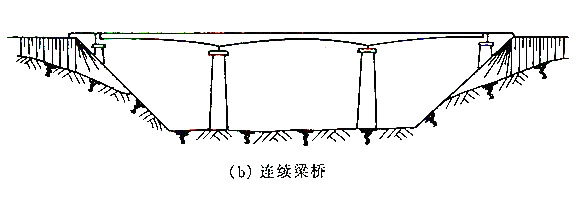 (2)連續(xù)梁式橋和懸臂梁式橋。連續(xù)梁橋相當于多跨簡支梁橋在中間支座處相連接貫通,形成整體的、連續(xù)的、多跨的梁結(jié)構(gòu)。連續(xù)梁橋是大跨度橋梁廣泛采用的結(jié)構(gòu)體系之一,一般采用預(yù)應(yīng)力混凝土結(jié)構(gòu)。