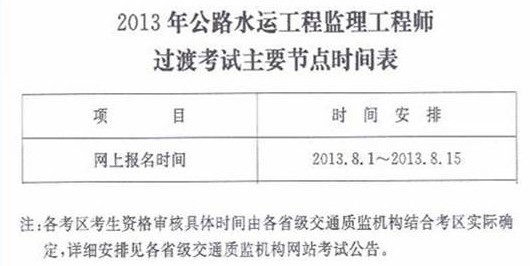 根據《關于組織2013年公路水運工程監理工程師過渡考試的通知》獲悉,2013年公路監理師考試報名時間為8月1日-15日。