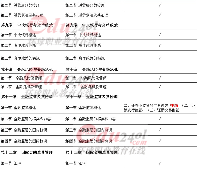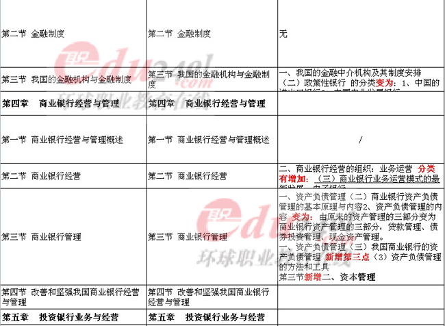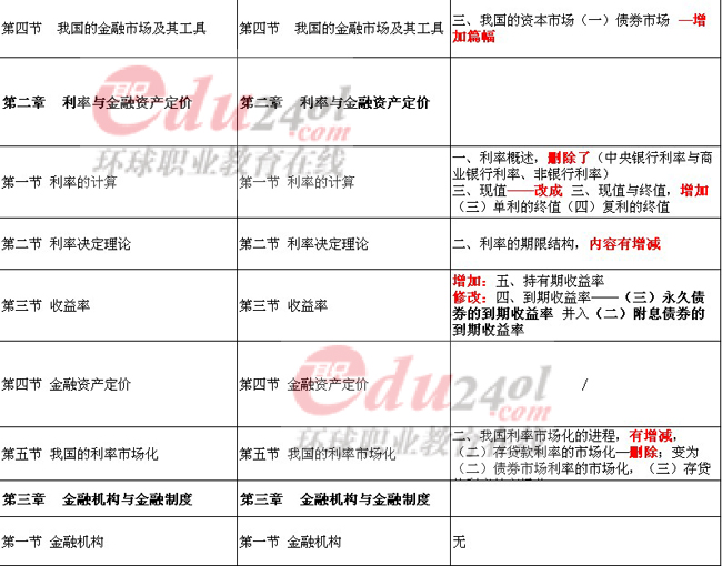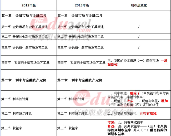 環(huán)球網(wǎng)校的小編們拿著12、13版教材進行了一一對比。從書的目錄來看,12、13版的教材的目錄沒有任何變化的。但是到具體的章節(jié)內(nèi)容里,還是會發(fā)現(xiàn)一些明顯的變動的。第二章利率與金融資產(chǎn)定價,第一節(jié) 利率的計算,一、利率概述,刪除了(中央銀行利率與商業(yè)銀行利率、非銀行利率)三、現(xiàn)值――改成 三、現(xiàn)值與終值,增加了(三)單利的終值(四)復利的終值;第二章利率與金融資產(chǎn)定價,第三節(jié)收益率 ,增加:五、持有期收益率,修改:四、到期收益率――(三)永久債券的到期收益率 并入(二)附息債券的到期收益率;第二章利率與金融資產(chǎn)定價,第五節(jié)我國的利率市場化,二、我國利率市場化的進程,有增減,(二)存貸款利率的市場化―刪除,變?yōu)?二)債券市場利率的市場化,(三)存貸款利率的市場化;第七章貨幣供求及其均衡,第二節(jié)貨幣供給,整節(jié)重新編排了,原來的一貨幣供給與貨幣供應(yīng)量和三貨幣供給機制,合并為一、貨幣供給過程。13版的教材最后依然是一套模擬試題,本套題部分題和12年的模擬題是一樣的題目。總結(jié)下來,發(fā)現(xiàn),今年的教材在各章節(jié)內(nèi)容中涉及到我國具體情況的地方,都有一些變動。另外,增加了對于相關(guān)內(nèi)容的概念性解釋。