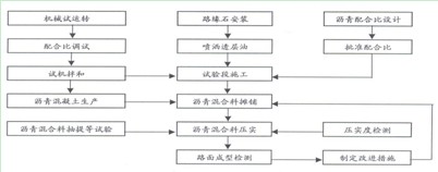 (2)施工準備:1)選購經調查試驗合格的材料進行備料,礦料應分類堆放,礦粉必須是石灰巖磨細而成不得受潮,必要時做好礦料堆放場地的硬化處理和場地四周排水及搭設礦粉庫房或儲存罐。2)做好配合比設計,報送監理工程師審批,對各種原材料進行符合性檢驗。3)在驗收合格的基層上恢復中線(底面層施工時)在邊線外側0.3~0.5m處,每隔5~10m釘邊樁進行水平測量,拉好基準線,畫好邊線。4)對下承層進行清掃,底面層施工前二天在基層上灑透層油。在中底面層上噴灑粘層油。 5)試驗段開工前28天安裝好試驗儀器和設備,配備好的試驗人員并報請監理工程師審核。各層開工前14天在監理工程師批準的現場備齊全部機械設備進行試驗段鋪筑,以確定松鋪系數、施工工藝、機械配備、人員組織、壓實遍數,并檢查壓實度,瀝青含量,礦料級配,瀝青混合料馬歇爾各項技術指標等。