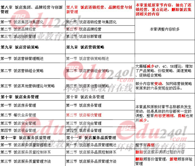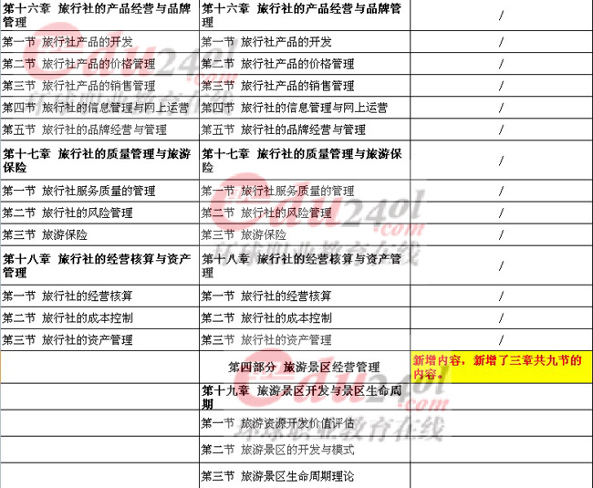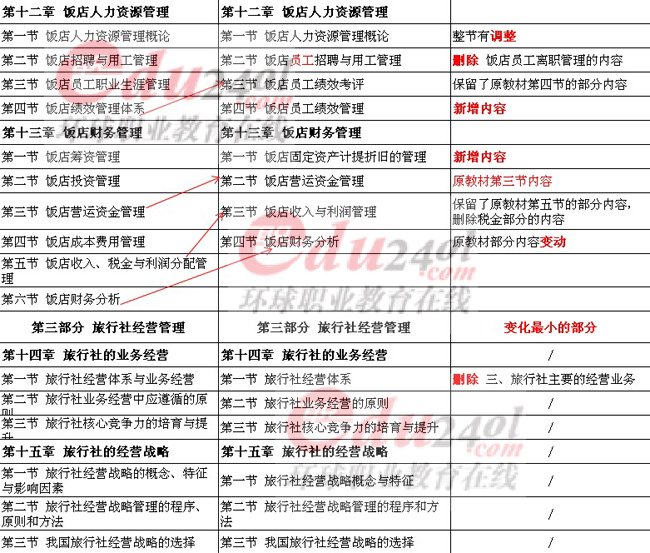 第一時間拿到中級旅游經濟專業知識與實務的教材,環球網校的小編們就快馬加鞭的為各位13年的學員們做起了新教材的分析。翻到中級旅游教材的目錄,發現第一大變化就是,今年的教材增加了一部分的內容,由原來的三大部分,變成四部分,增加的部分是第四部分旅游景區經營管理,三章共九節的內容。但是,整本書的篇幅卻和比12版的教材還要少十幾頁,這就是最新版教材變化的第二個特點,即原教材三大部分的內容經過重新編排都更精練,不少章節中涉及的一些理論都更概況,甚至有的章節干脆就刪除了理論方面的內容。例如第九章 第二節飯店營銷組合策略大篇幅減少4P、4C、5R理論。具體的變動情況詳見下表。
