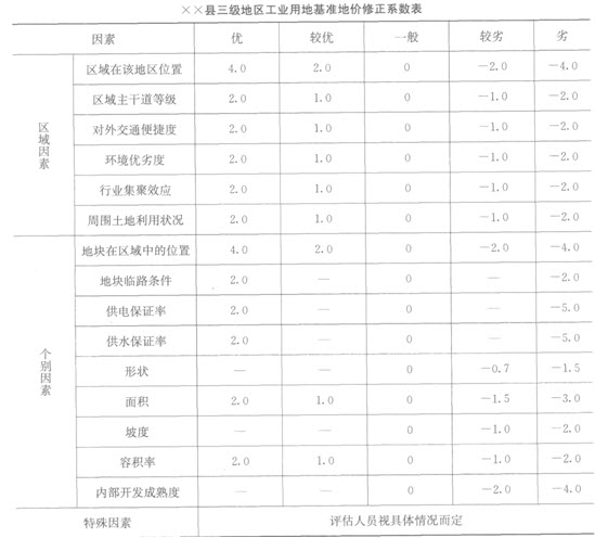 基準地價是同一地區工業用地平均地價水平的反映,具體地塊地價受到多方面因素的影響。以下是××縣三級地區工業用地基準地價修正系數表。