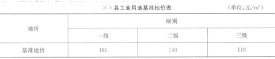 根據××縣人民政府《關于××縣城區商業、住宅及全縣工業用地基準地價的通告》,××縣城區工業用地基準地價劃分為三個級別,具體地價詳見下表。