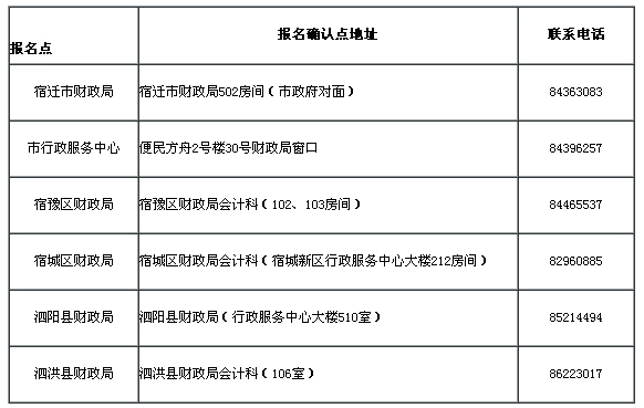 特別提醒:從2013年起,沭陽縣考點單設,沭陽縣考生報名、考試由沭陽縣財政局統一組織,相關事項咨詢沭陽縣財政局會計局,咨詢電話83551380。