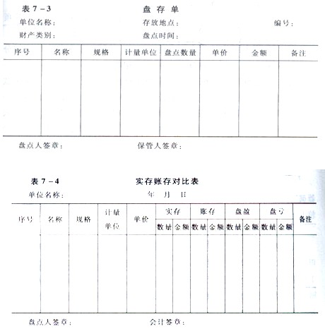 對各項財產物資的盤點結果,應逐一填制“盤存單”,并同賬面余額記錄核對,確認盤盈盤虧數,填制“實存賬存對比表”,作為調整賬面記錄的原始憑證。盤存單及實存賬存對比表的格式如表7―3與表7―4所示。