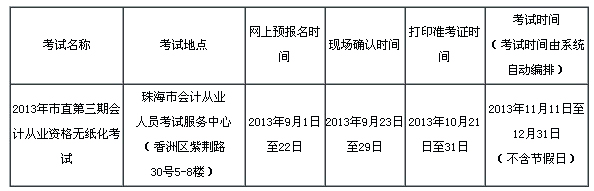根據《2013下半年珠海會計從業資格考試通知》,2013年下半年會計從業資格無紙化考試安排表如下: