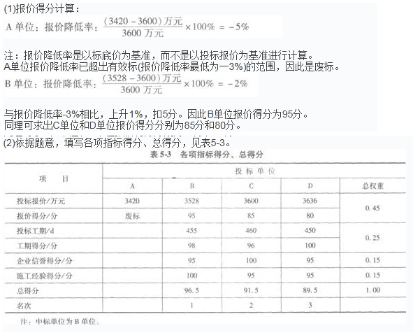 (2)定額工期為500d。評(píng)分方法:工期提前10%為100分,在此基礎(chǔ)上每拖后5d扣2分。
