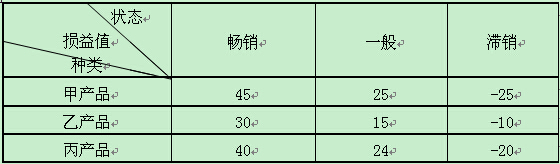 國外某連鎖快餐企業(yè)將目標(biāo)顧客定位于中國市場,近年來不斷生產(chǎn)適合中國人口味的快餐,取得了較好的收入。該企業(yè)和中國另外一家實力強(qiáng)大的快餐A公司各自出資50%,形成一個新的企業(yè),兩家企業(yè)共擔(dān)風(fēng)險,共享利益。為進(jìn)一步提高市場占有率,該企業(yè)以銷售渠道共享的形式與中國某知名快餐B公司結(jié)成戰(zhàn)略聯(lián)盟,在中國多個城市銷售其快餐產(chǎn)品。新型快餐產(chǎn)品方案共有甲產(chǎn)品、乙產(chǎn)品、丙產(chǎn)品三種可供選擇。每種產(chǎn)品方案均存在著暢銷、一般、滯銷三種市場狀態(tài)。每種方案的市場狀態(tài)及損益值如下表所示:單位(萬元)
