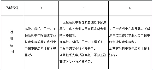 根據(jù)《關(guān)于調(diào)整完善我省職稱外語(yǔ)政策的通知》(粵人發(fā)〔2007〕120號(hào)),考試等級(jí)劃分及適用范圍如下: