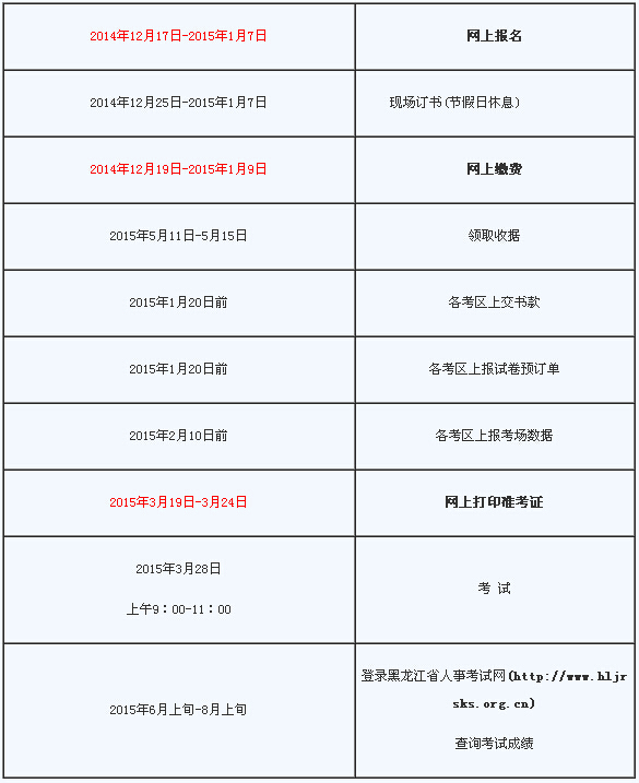 考試實行網上報名,報名網址為http://www.hljrsks.org.cn(黑龍江省人事考試網)。考生須在文件規定時間內(詳見附件2)完成網上報名、網上繳費等全部報名流程。未在規定時間內完成網上繳費,視為自動放棄,報名無效。考生操作流程請登錄黑龍江省人事考試網(http://www.hljrsks.org.cn)的“考試安排”欄目查詢。