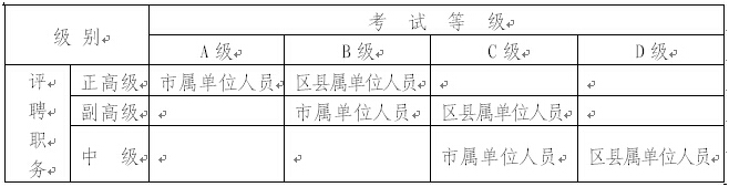 6.市屬單位長(zhǎng)期在野外(基層一線)從事農(nóng)業(yè)、林業(yè)、水利、采礦、測(cè)繪、勘探、鐵路施工、公路施工等專業(yè)技術(shù)工作的人員,經(jīng)單位證明、市級(jí)主管部門審查同意,其職稱外語(yǔ)考試可按上表所列“區(qū)縣屬單位人員”規(guī)定級(jí)別報(bào)考。