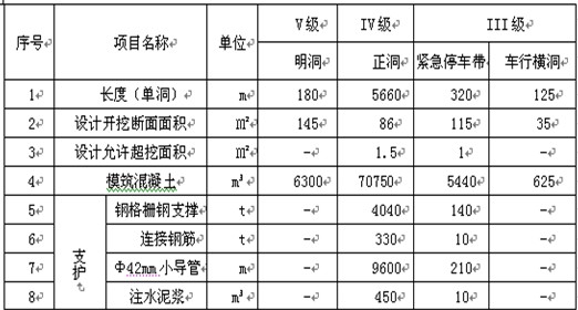八、某高速公路分離式隧道,上、下行隧道長度一致,洞內(nèi)設(shè)有緊急停車帶、車行橫洞(均設(shè)置于III級圍巖),上下行隧道各圍巖級別長度、設(shè)計(jì)開挖斷面面積及支護(hù)工程量見下表。