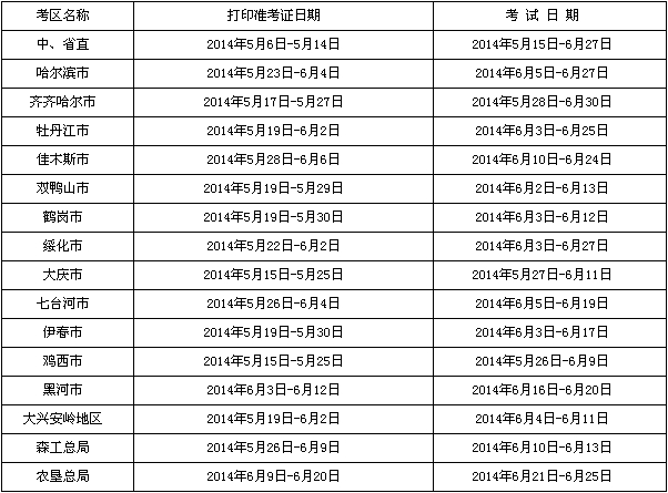 2014年度黑龍江省專業技術人員計算機應用能力考試各考區考試日期及打印準考證時間安排詳見下表,請考生按照規定時間登錄黑龍江省人事考試網(http://www.rsks.gov.cn)的“準考證打印”欄目打印準考證,逾期不予受理。