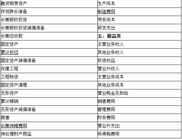 會計科目按其所歸屬的會計要素不同,一般分為資產類、負債類、所有者權益類、成本類、損益類等五大類,每一大類會計科目可按一定標準再分為各個具體科目。