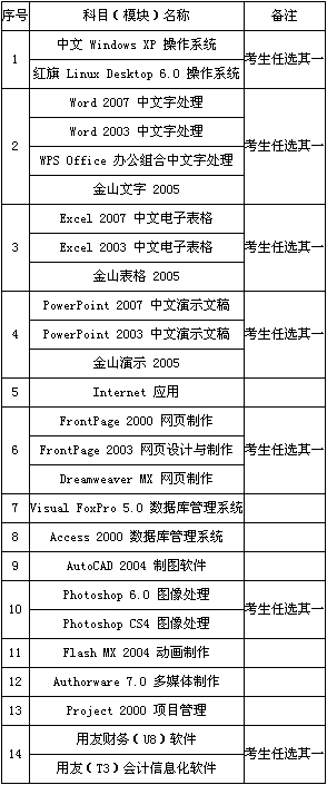 2014年度全國專業(yè)技術人員計算機應用能力考試科目(模塊)設置