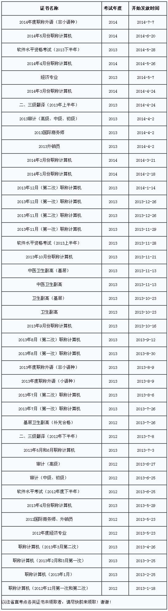 全國計算機應用能力考試(1-12月份)、全國職稱外語考試、衛生專業副高級考試、計算機技術與軟件(水平)考試、審計專業、經濟專業、國際商務師、外銷員、二、三級翻譯資格(筆譯),具體開始發放時間請看列表公布的動態通知。