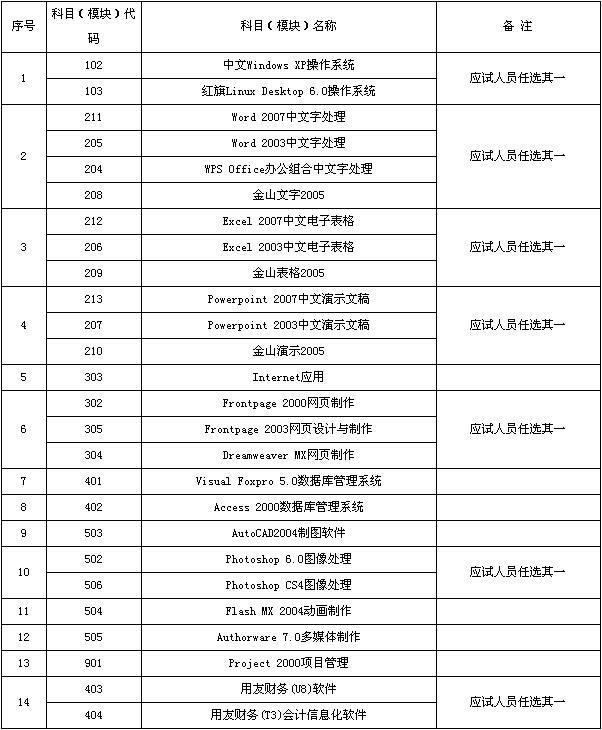 同一類別,不同的科目(模塊)中只能選擇一個(gè),如Word 2007中文字處理、Word 2003中文字處理、WPS Office辦公組合中文處理、金山文字2005,四個(gè)科目中只能選考一個(gè)科目。
