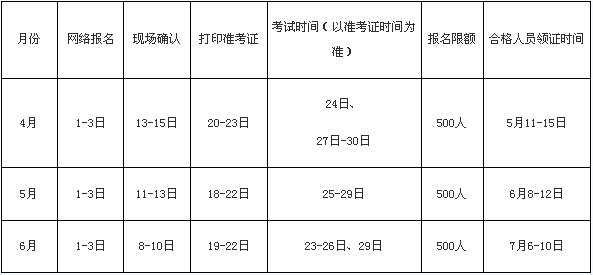 2015年每月都要安排考試,月初報名,月末考試,限額報名,額滿為止。二季度具體時間如下: