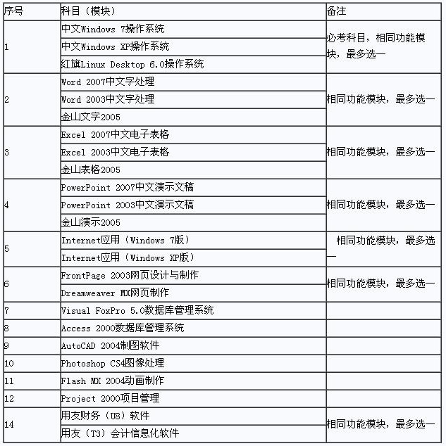 1.操作系統為必考科目(中文Windows 7、Windows XP或紅旗LinuxDesktop 6.0 三選一),其他科目自選。考生所在單位如有特殊要求(要求高于云南省標準),請按單位標準報名考試。