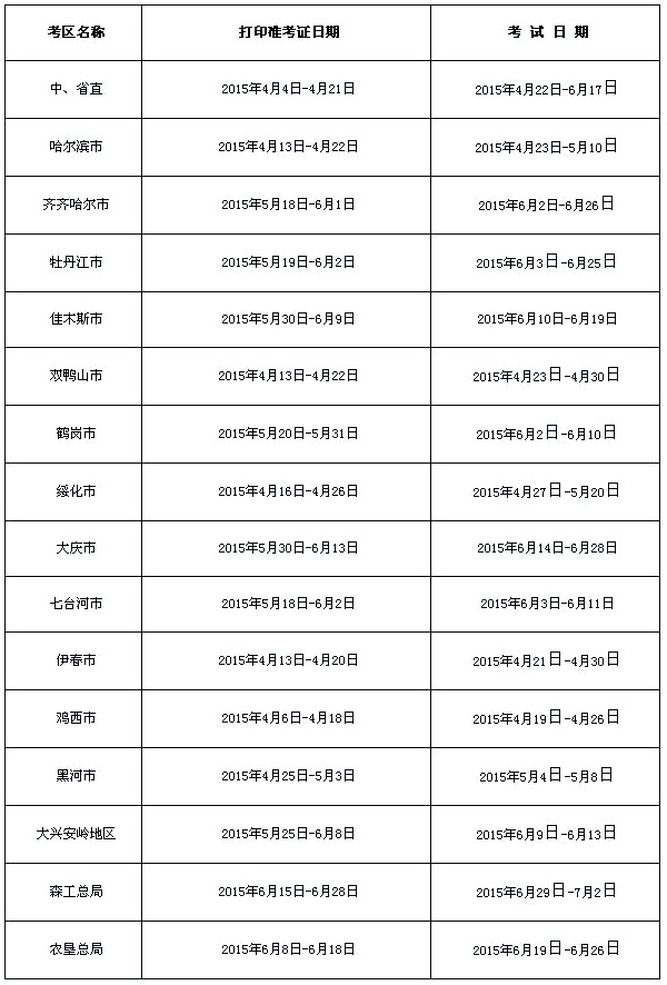 2015年黑龍江各市職稱計算機考試日期及準考證打印時間安排表
