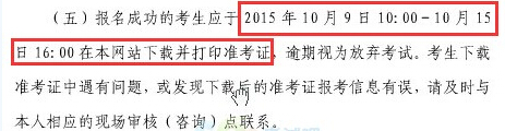 根據(jù)上海職業(yè)能力考試院發(fā)布的《 上海關(guān)于2015審計(jì)專業(yè)技術(shù)資格考試工作的通知 》得知,2015年上海審計(jì)師考試準(zhǔn)考證打印時(shí)間為10月9-15日。具體公告截取如下: