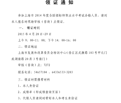 摘要 上海市職業能力考試院:2014年招標師考試證書領取通知