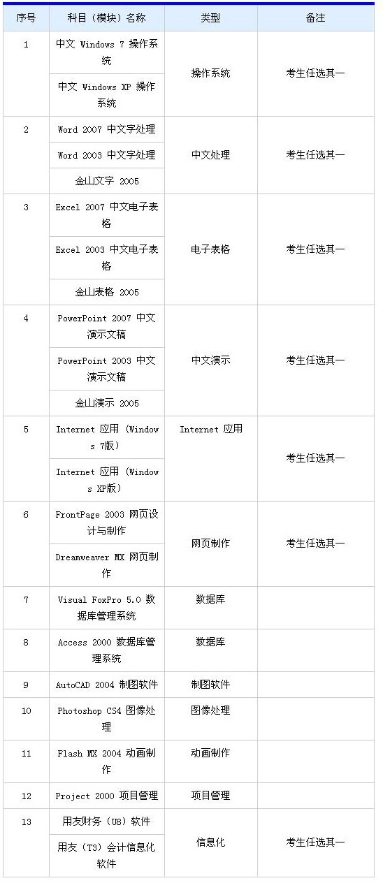 從2015年1月1日起畢節市專業技術人員計算機應用能力考試將按照變更后的科目(模塊)提供考試相關服務,變更后的考試系統共有23個科目(模塊)。