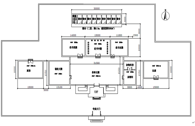 主體建筑包括供奉主殿、誦經(jīng)大殿、經(jīng)書殿和雜物間,均為單層。其中,供奉主殿建筑面積480┫,凈高8.5m;誦經(jīng)大殿建筑面積180┫,凈高6m;經(jīng)書東殿建筑面積110┫,凈高6m;經(jīng)書中殿建筑面積150┫,凈高6m;經(jīng)書西殿建筑面積140┫,凈高6m;雜物間建筑面積110┫,凈高5m。