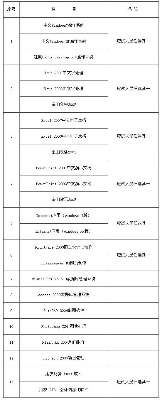 二、中文Windows XP操作系統、中文Window7操作系統與紅旗Linux Desktop 6.0操作系統,Word 2003中文字處理 、Word 2007中文字處理與金山文字2005,Excel 2003中文電子表格 、Excel 2007中文電子表格與金山表格2005,PowerPoint 2007中文演示文稿、PowerPoint 2003中文演示文稿與金山演示2005,以上對應科目(模塊)是同一類別,如以往通過舊科目(模塊)的,也不能報考其所在類別的科目(模塊)。