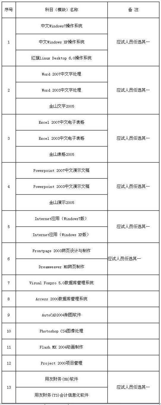 中文Windows XP操作系統(tǒng)與中文Window 98,Word 2003中文字處理與Word 97中文字處理,Excel 2003中文電子表格與Excel 97中文電子表格,PowerPoint 2003中文演示文稿與PowerPoint97中文演示文稿,Internet應(yīng)用與計算機(jī)網(wǎng)絡(luò)應(yīng)用基礎(chǔ),以上對應(yīng)科目(模塊)是同一類別,如以往通過舊科目(模塊)的,也不能報考其所在類別的科目(模塊)。