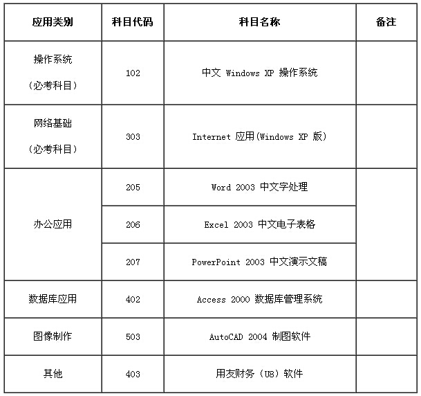 全國專業(yè)技術人員計算機應用能力考試,采取科目模塊化設計,科目名稱及代碼,科目設置如下: