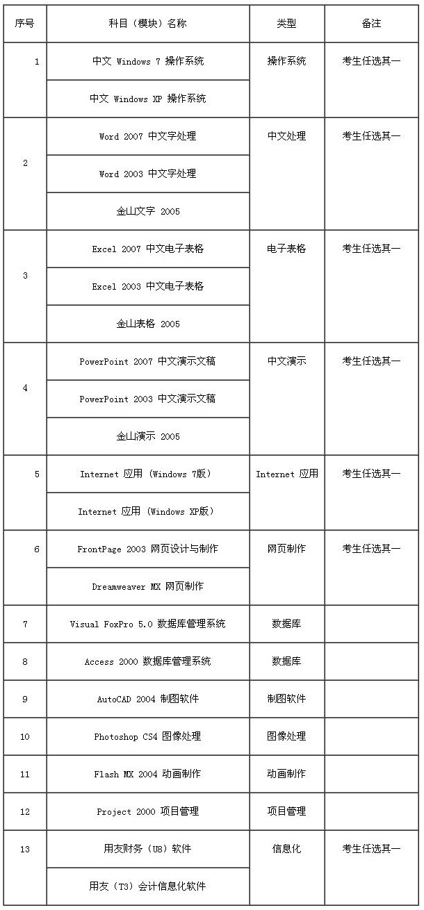 從2015年1月1日起畢節市專業技術人員計算機應用能力考試將按照變更后的科目(模塊)提供考試相關服務,變更后的考試系統共有23個科目(模塊)。