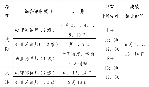 (二)根據(jù)考生地域分布情況,分別在沈陽(yáng)、大連兩個(gè)考區(qū)設(shè)置綜合評(píng)審考點(diǎn),其中大連考區(qū)負(fù)責(zé)組織通過(guò)大連市、丹東市、營(yíng)口市鑒定中心組織報(bào)名的心理咨詢師、企業(yè)培訓(xùn)師考生,其余考生的綜合評(píng)審在沈陽(yáng)考區(qū)組織實(shí)施。