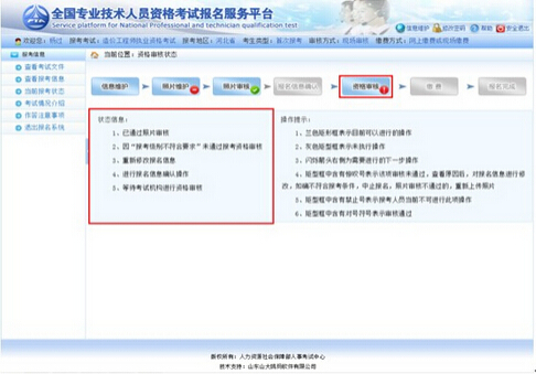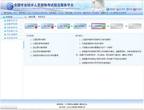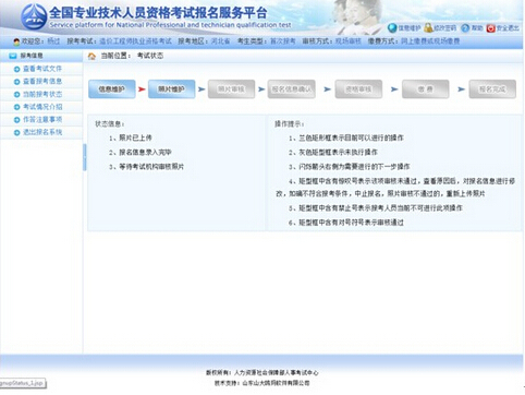 界面左側顯示狀態信息,右側顯示操作提示,請報考人員參考上述信息進行相關操作,直到報名完成。