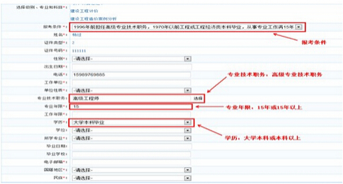 報考條件7:1996年前擔任高級專業技術職務,1970年以前工程或工程經濟類本科畢業,從事專業工作滿15年。 所需條件:【專業技術職務】選擇高級專業技術職務,【學歷】字段需選擇大學本科或者本科以上,【專業年限】字段需填寫15或者大于15的數字(見下圖)。