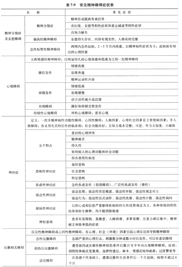 常見精神障礙癥狀見表7-9。