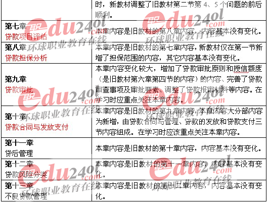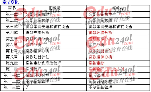 2010年新版《公司信貸》教材(以下簡(jiǎn)稱“新教材”)與2009年舊版教材(以下簡(jiǎn)稱“舊教材”)相比,頁(yè)碼從舊教材的414頁(yè)減少到新教材的365頁(yè),章節(jié)由十二章調(diào)整為十三章,頁(yè)數(shù)減少主要為新教材排版的調(diào)整。新教材進(jìn)行系統(tǒng)化地全面梳理,調(diào)整了部分章節(jié)設(shè)置,根據(jù)新頒布的法規(guī)對(duì)相關(guān)內(nèi)容進(jìn)行了修訂和補(bǔ)充,增加了貸款審批、貸款合同與發(fā)放支付等方面的內(nèi)容;調(diào)整了貸款環(huán)境分析、借款需求分析、貸款項(xiàng)目評(píng)估和貸款擔(dān)保分析等章節(jié)的順利。總的來說,新教材內(nèi)容有一定變化,但變化內(nèi)容不是很多,建議參加下半年考試的學(xué)員購(gòu)買新教材。具體章節(jié)內(nèi)容變化如下: