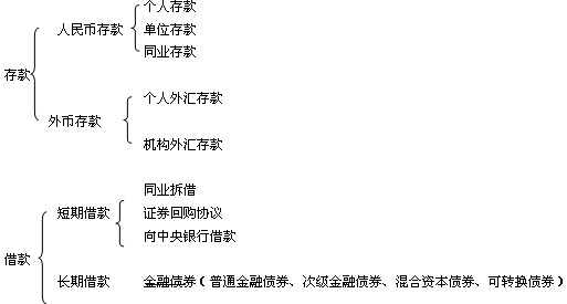 人民幣存款:又分為個人存款、單位存款和同業存款,外幣存款又分為個人外匯存款和機構外匯存款。