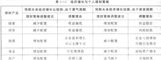 表1―2列出了經濟增長對個人投資理財策略產生影響的不同情況,表中的分析建議,僅供參考。